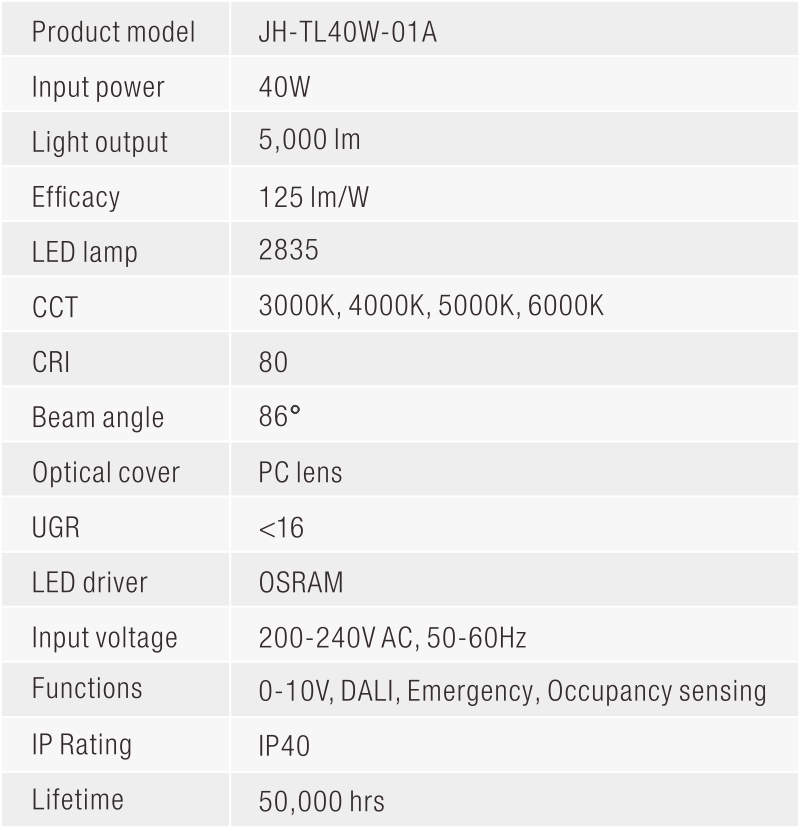 - • Optional function: 0-10V or DALI dimmable, emergency or occupancy sensing.