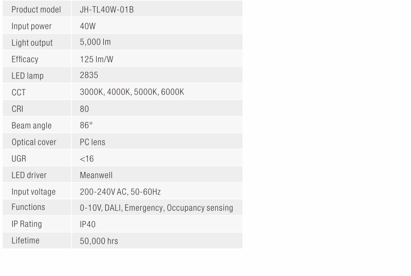 - • Optional function: 0-10V or DALI dimmable, emergency or occupancy sensing.
