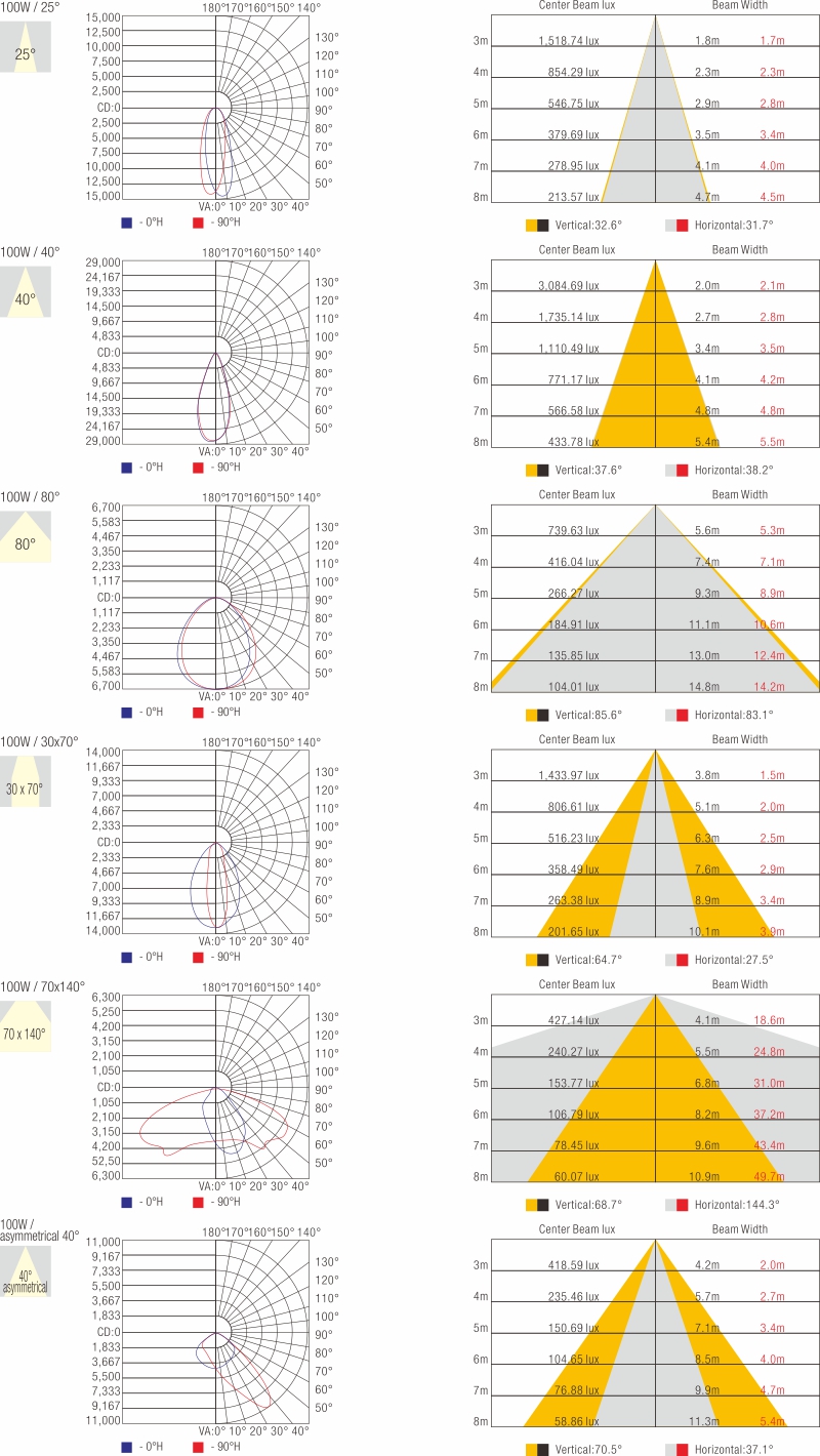 - • Beam angles: 250, 400 asymmetrical,40°,80°,120°,30x70°, 70x140°.