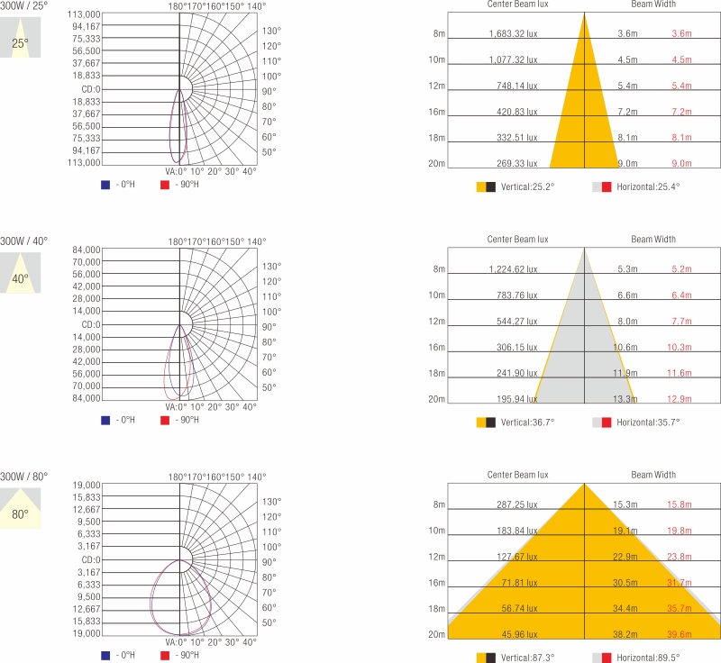 - • Beam angles: 250, 400 asymmetrical,40°,80°,120°,30x70°, 70x140°.