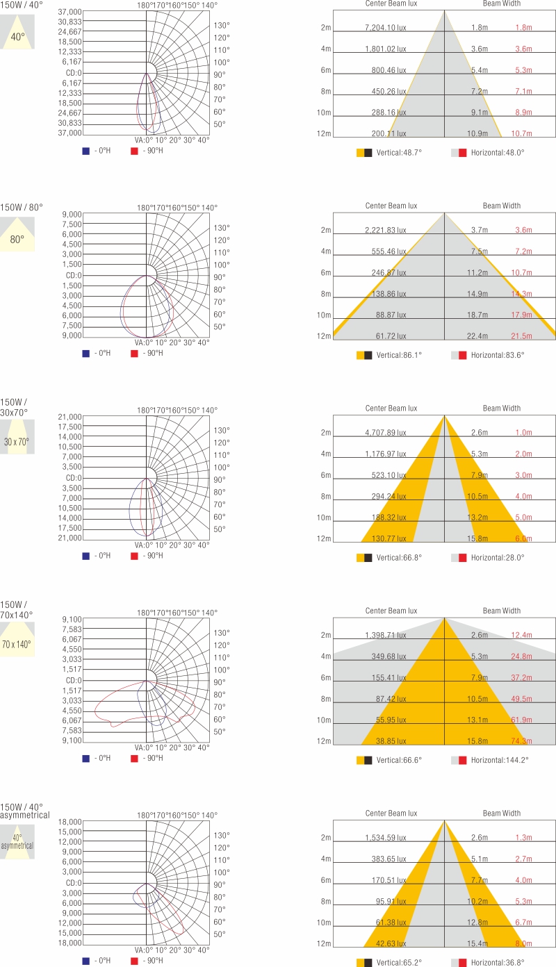 - • Beam angles: 40°, 80°, 120°, 30x70°, 70x140°, 40°asymmetrical.